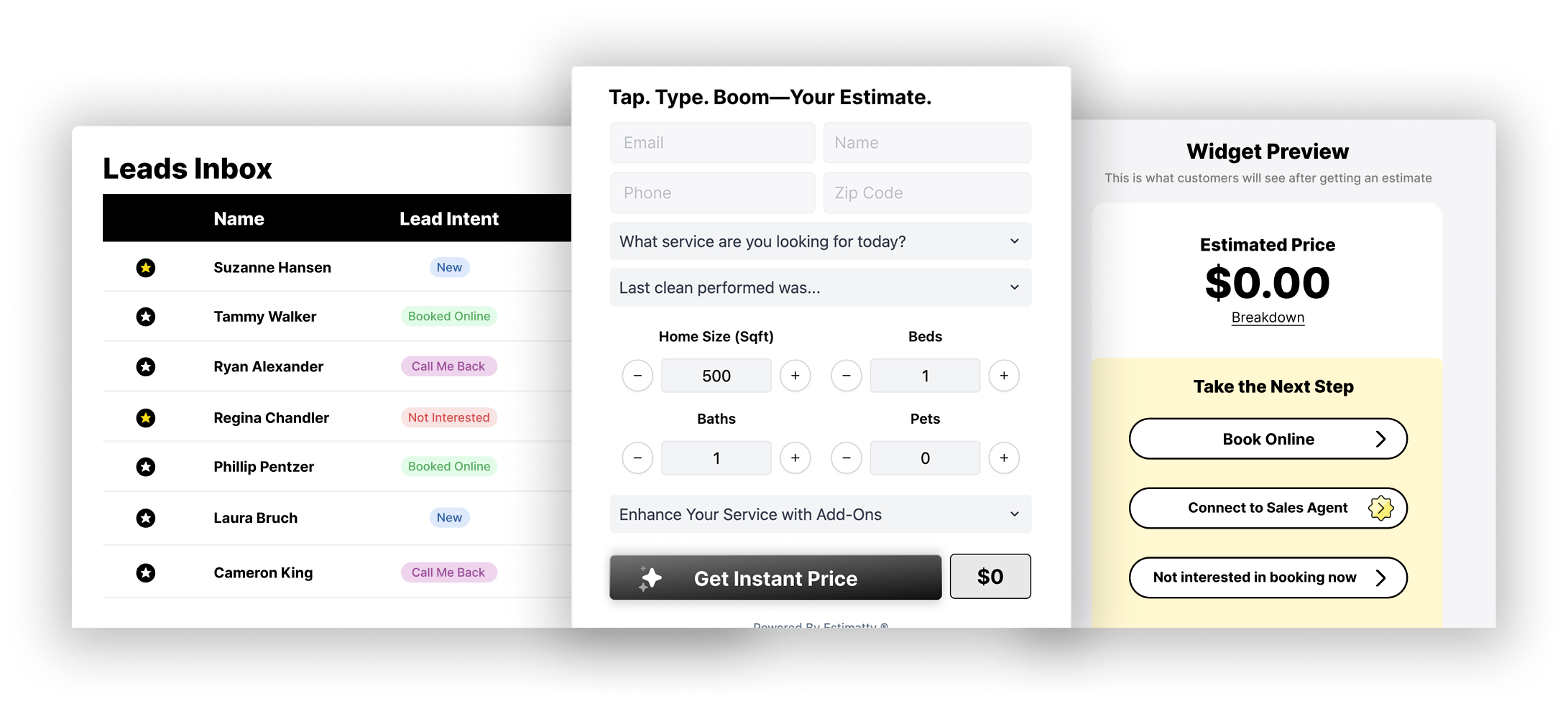 Estimatty’s price calculator fits perfectly on our homepage and makes getting a cleaning estimate super easy. In under 30 seconds, visitors are already booking or talking to a saless rep. 10/10.