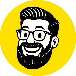 Black and white illustration of a smiling man with glasses, a beard, and a headset microphone, surrounded by radiating lines.